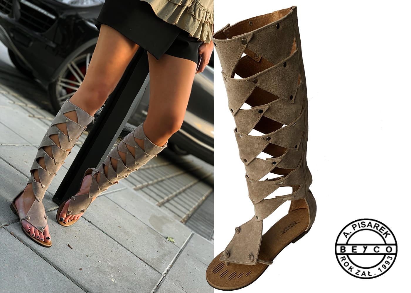 Modelka na zdjęciu ma 169 cm wzrostu i 34 cm w łydce, w najtęższym miejscu. Prezentuje rozmiar 37/38.
