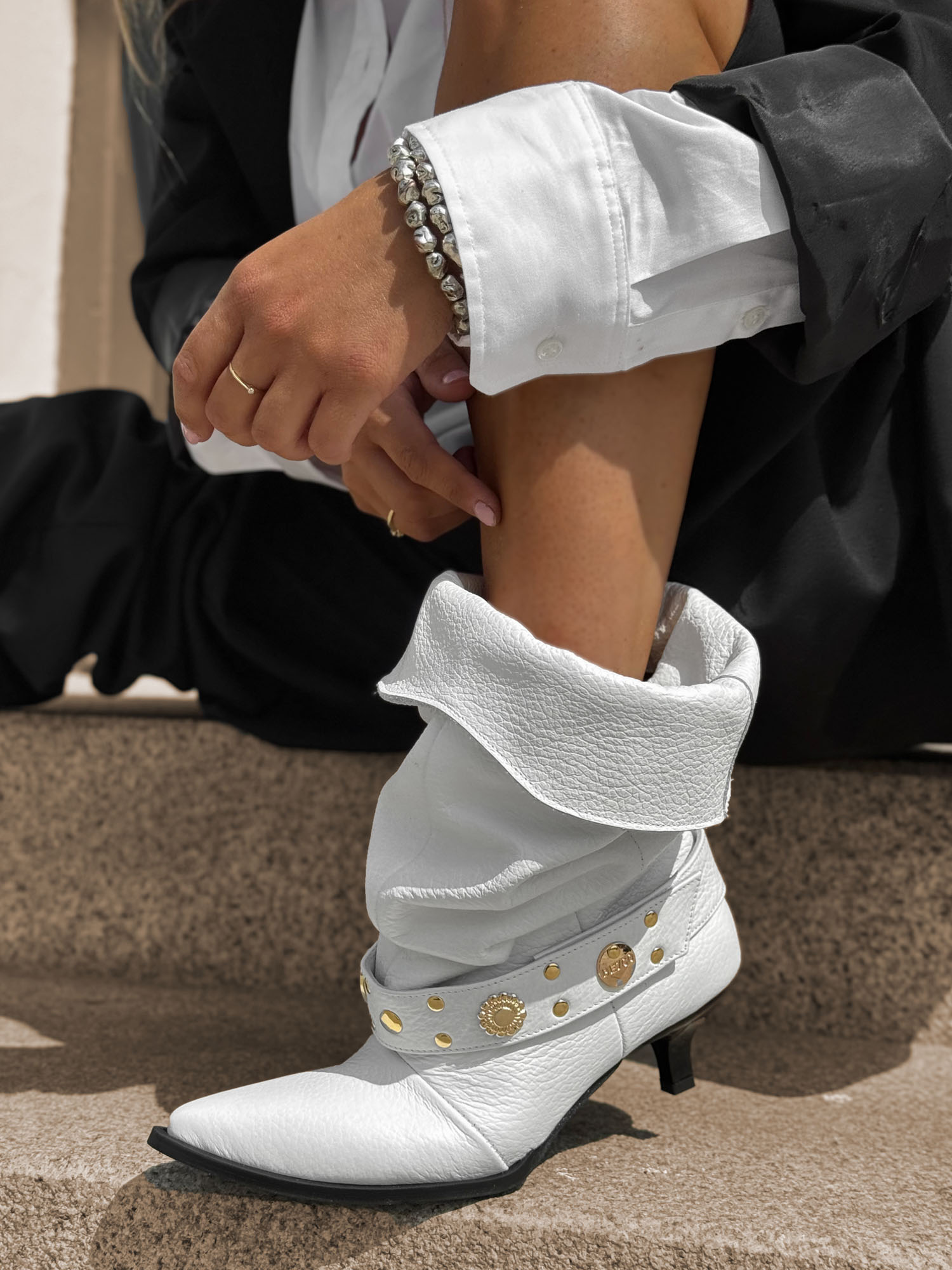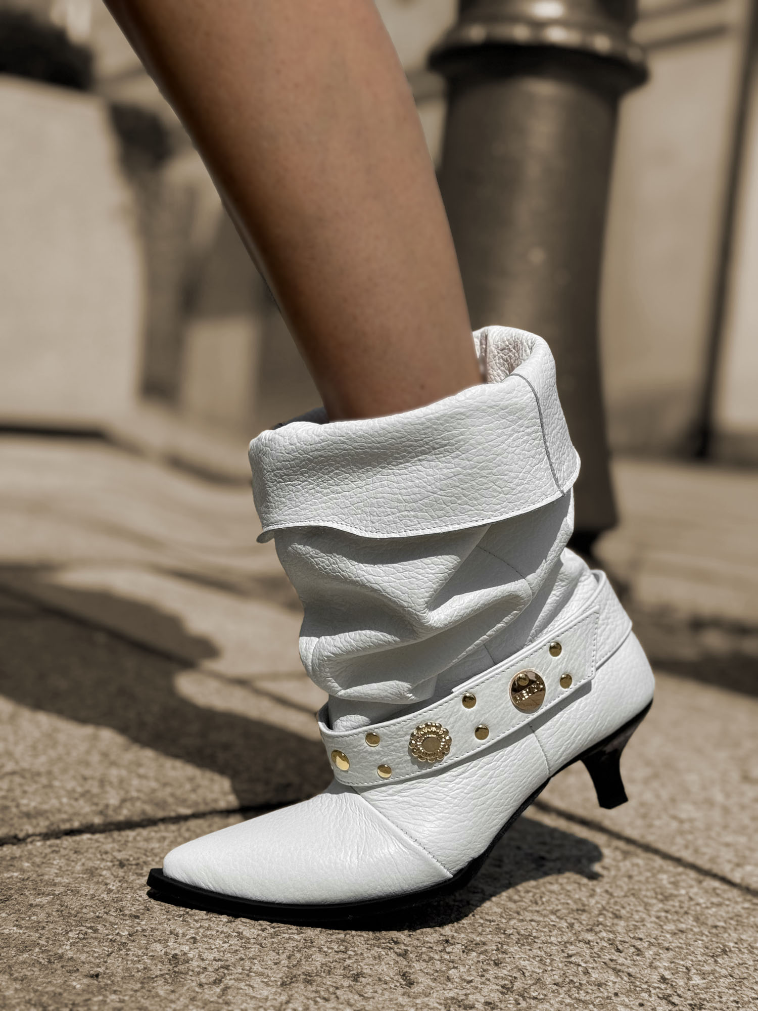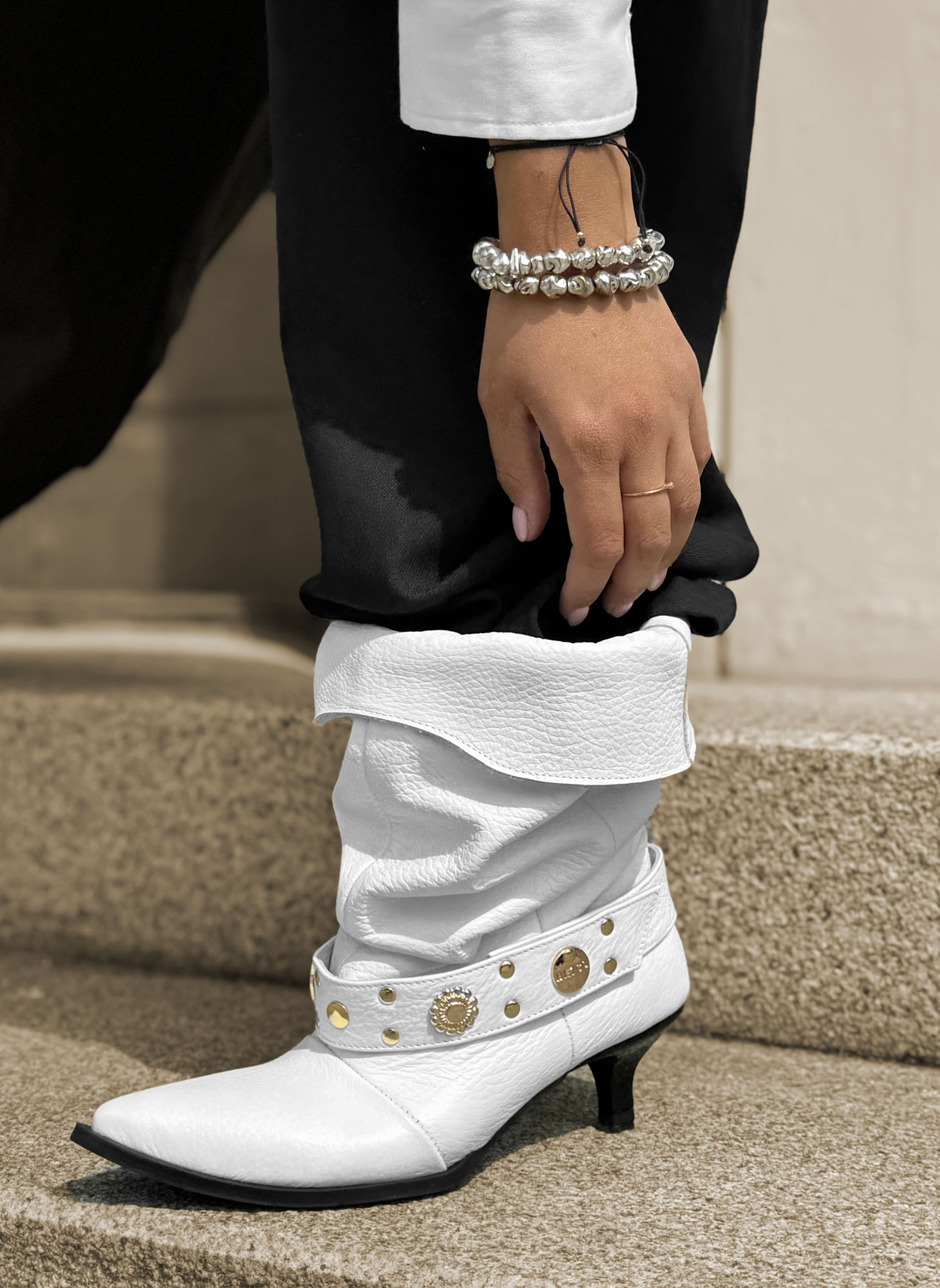 Modelka na zdjęciu ma 169 cm wzrostu i 34 cm w łydce, w najtęższym miejscu. Prezentuje rozmiar 37/38.