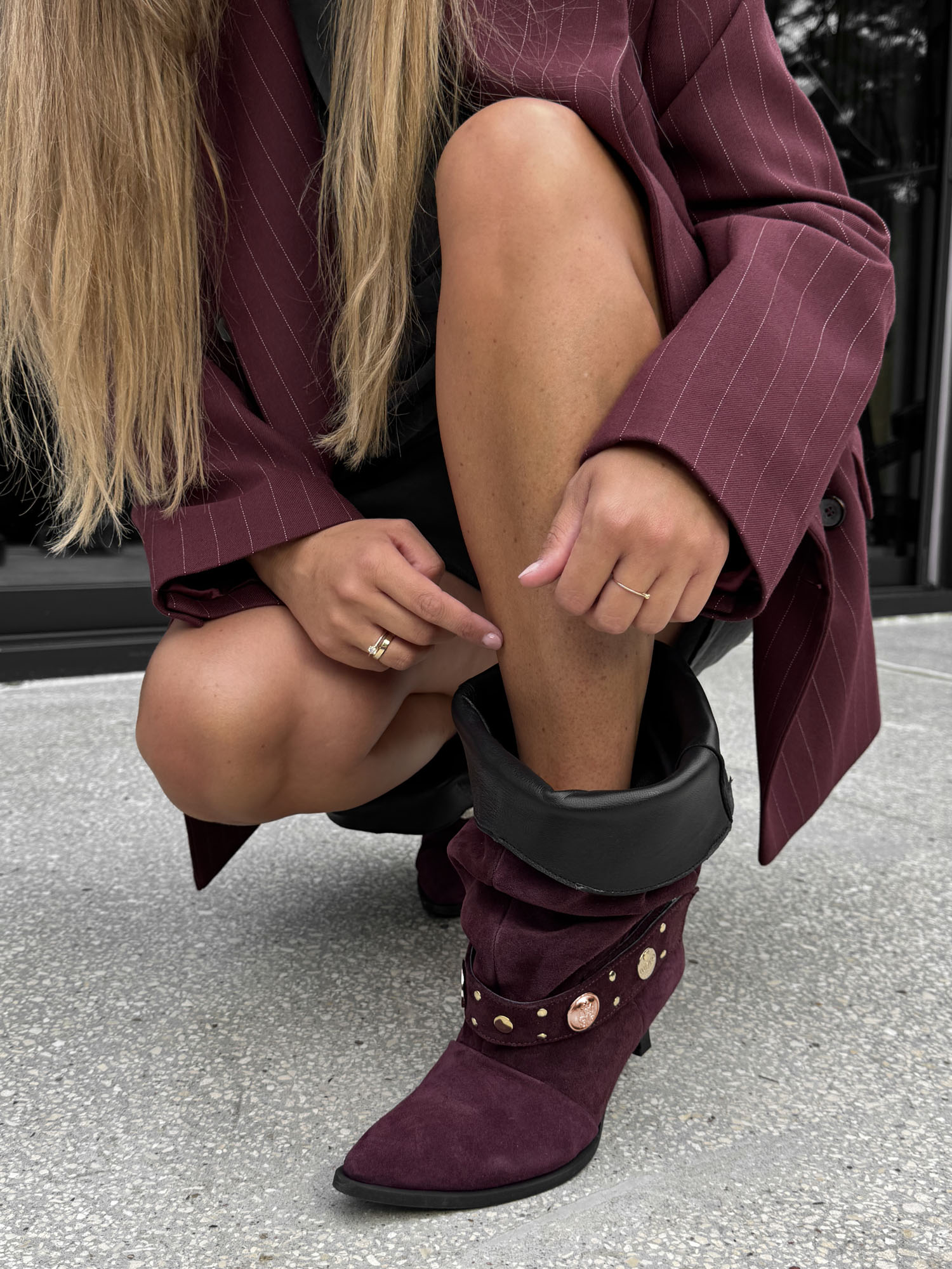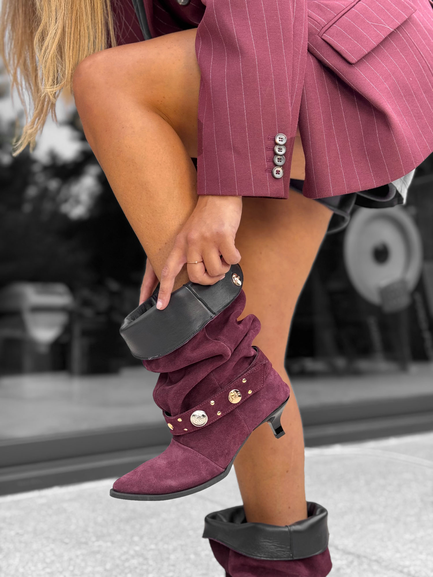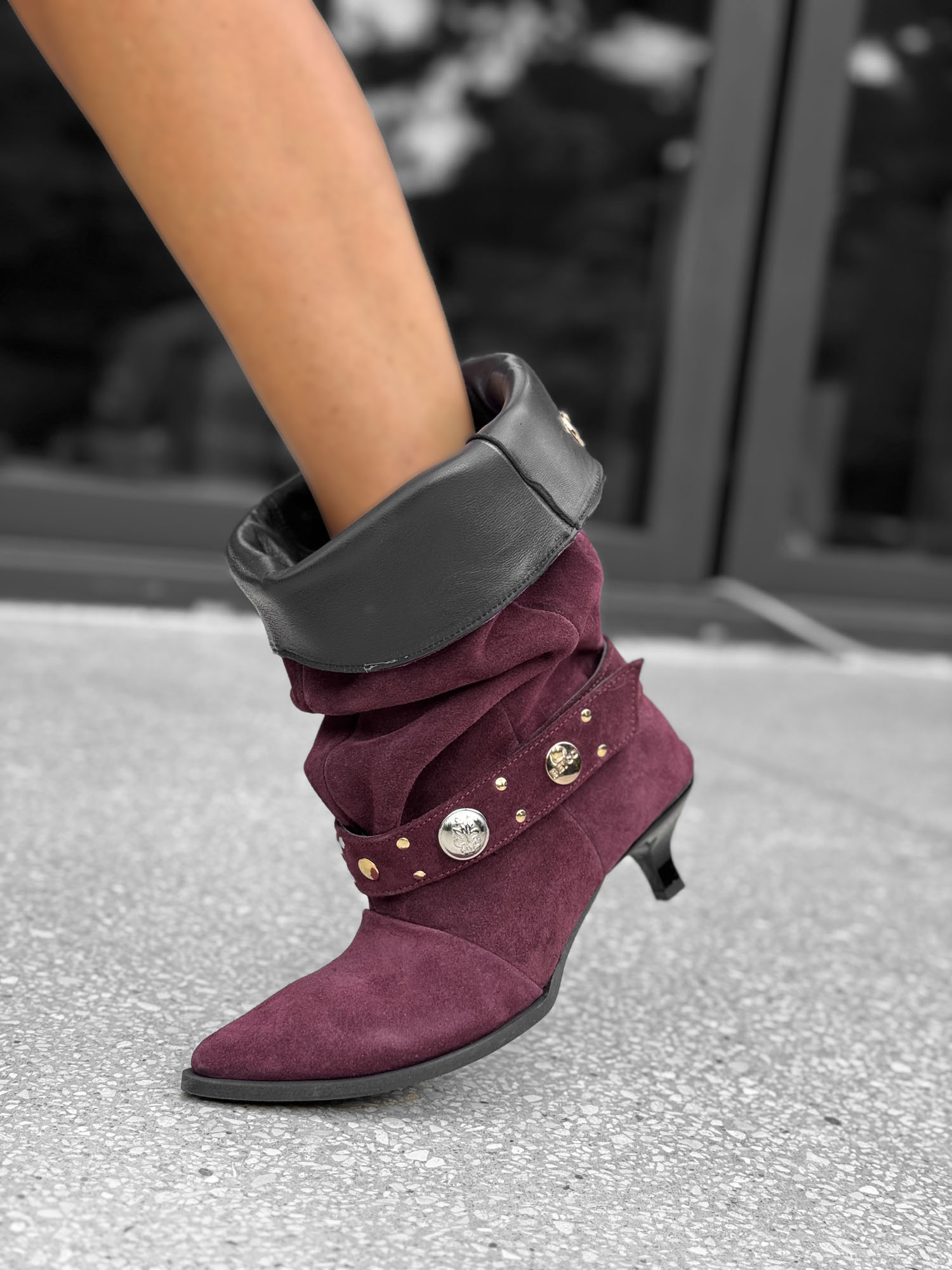Kozaki damskie 25-20 na obcasie w ciepłym odcieniu bordowego zamszu to połączenie kobiecej elegancji i swobodnego stylu. Miękka, lekko marszczona cholewka dodaje lekkości, a pasek ze złotymi detalami i medalionem podkreśla ich unikalny charakter. Idealne do miejskich stylizacji – świetnie prezentują się zarówno z sukienką, jak i jeansami.