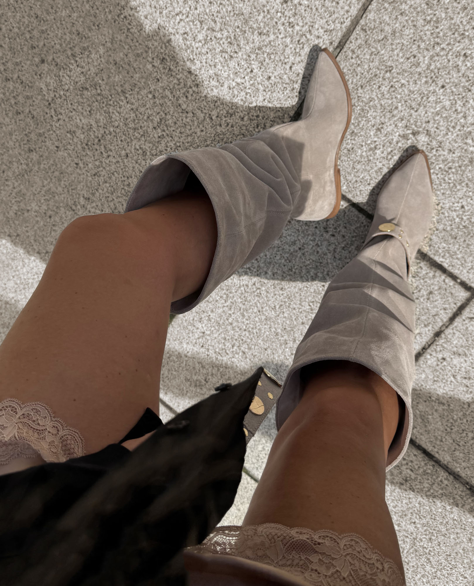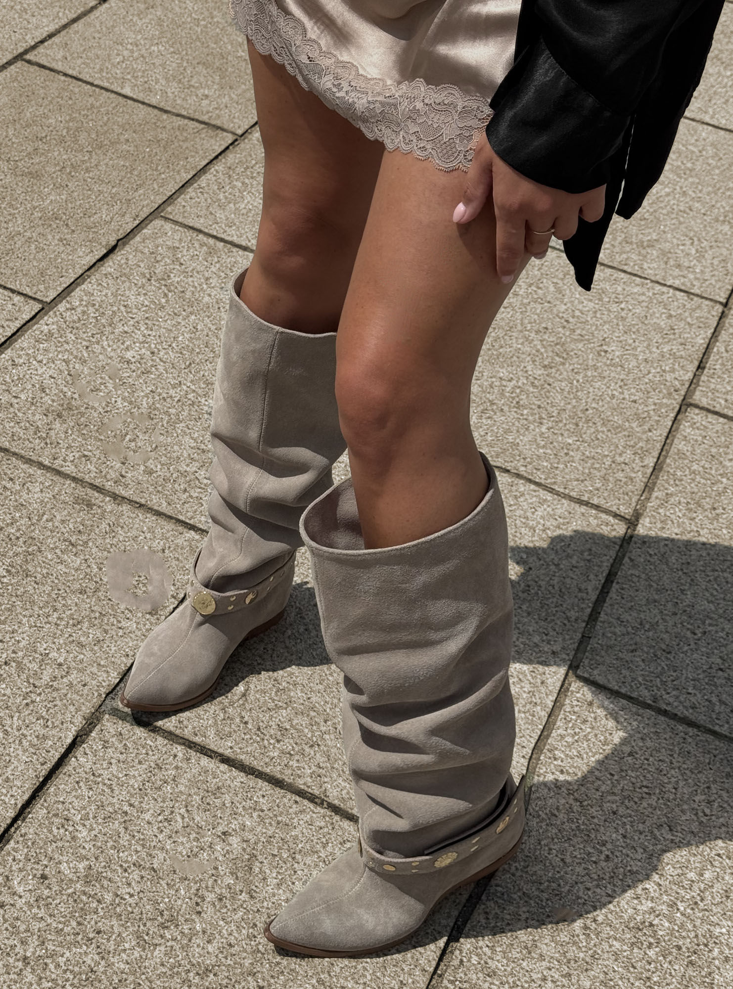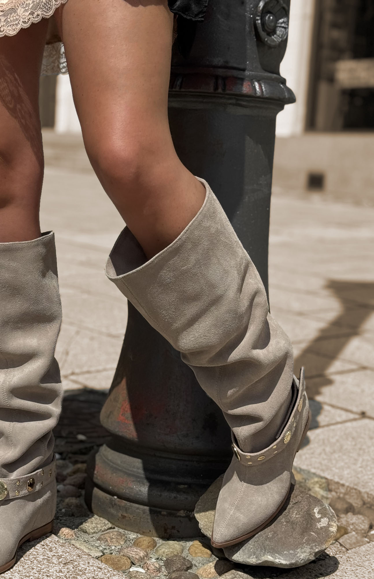 Modelka na zdjęciu ma 169 cm wzrostu i 34 cm w łydce, w najtęższym miejscu. Prezentuje rozmiar 37/38.