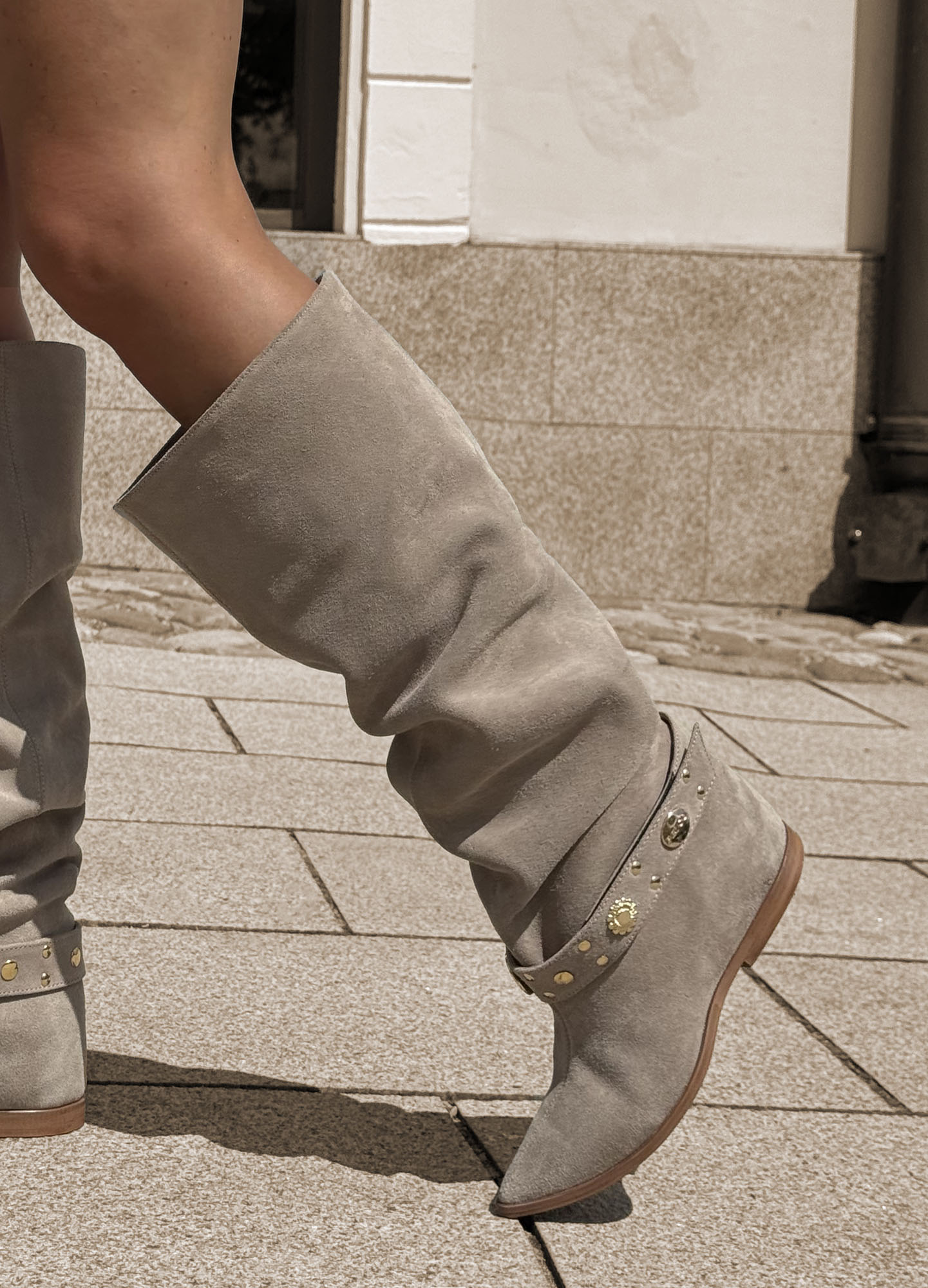 Stylowe kozaki damskie 25-21 w odcieniu beżowego zamszu to must-have na każdą porę roku. Luźna cholewka nadaje im swobodnego charakteru, a ozdobny pasek ze złotymi nitami i medalionem podkreśla wyjątkowy design. Idealne do sukienek i jeansów – dodadzą Twoim stylizacjom odrobiny boho i elegancji w jednym.