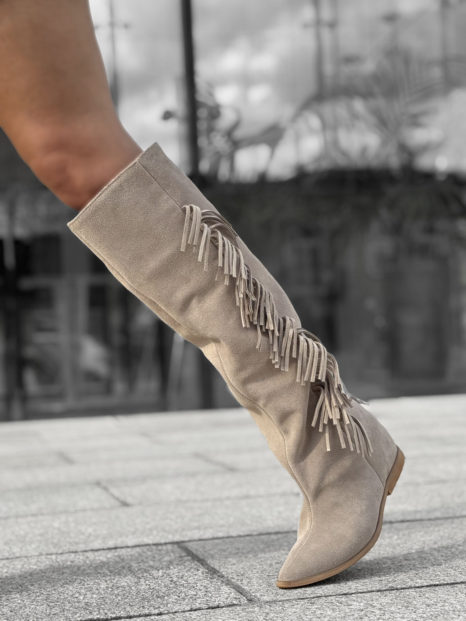 Wysokie kozaki 25-24 z miękkiego zamszu w odcieniu beżu to idealne połączenie mody i komfortu. Ozdobne frędzle dodają charakteru, a ukryty koturn subtelnie wysmukla sylwetkę. Świetnie sprawdzą się do sukienek, spódnic i jeansów – idealne na jesień i wiosnę!