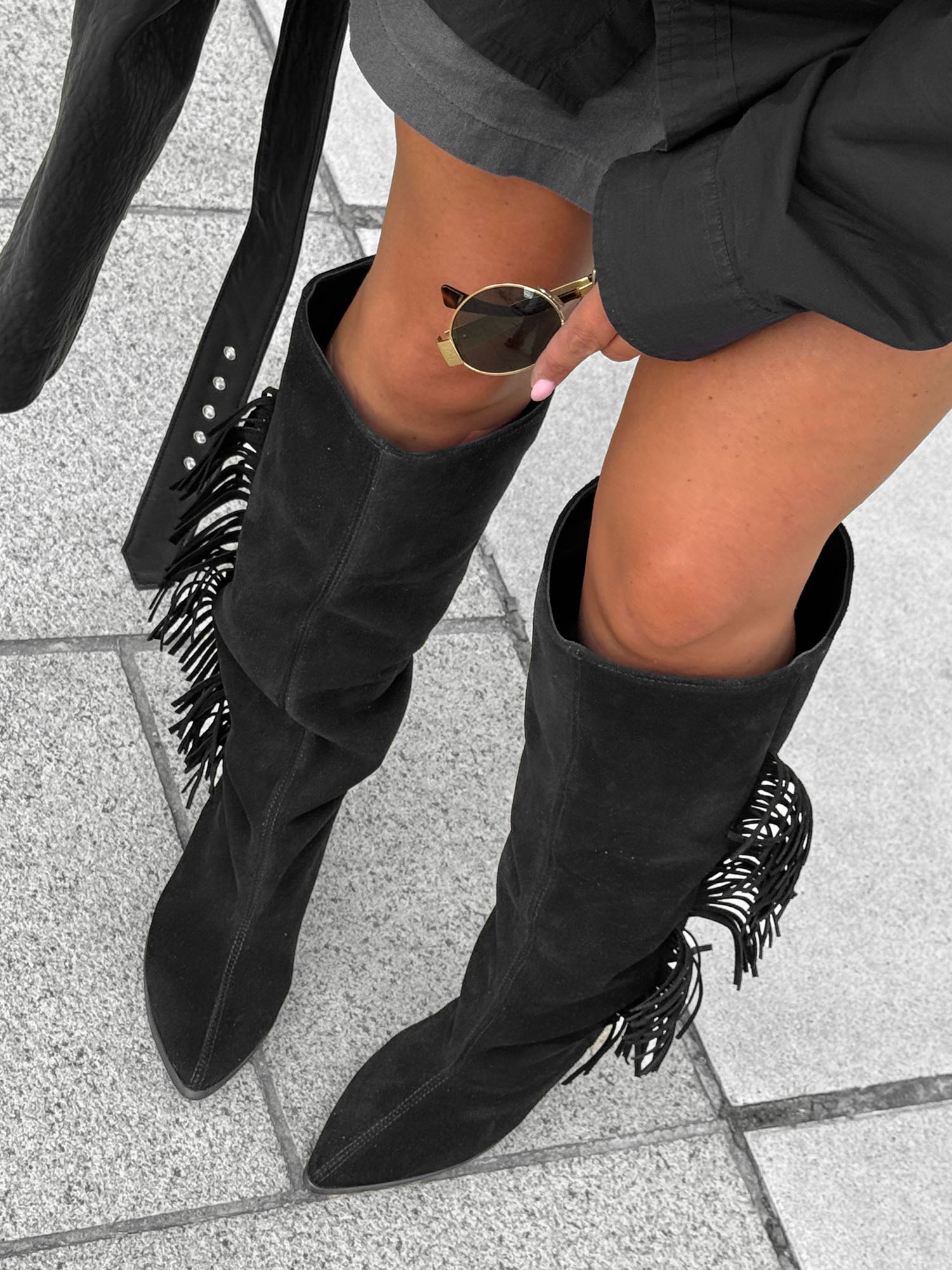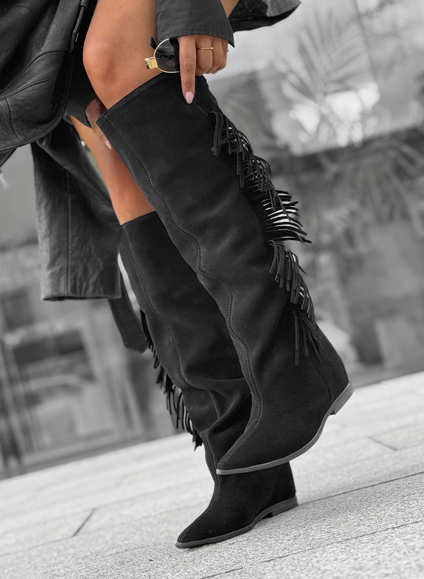 Wysokie kozaki 25-24 z miękkiego zamszu w czarnym odcieniu to idealne połączenie mody i komfortu. Ozdobne frędzle dodają charakteru, a ukryty koturn subtelnie wysmukla sylwetkę. Świetnie sprawdzą się do sukienek, spódnic i jeansów – idealne na jesień i wiosnę!
