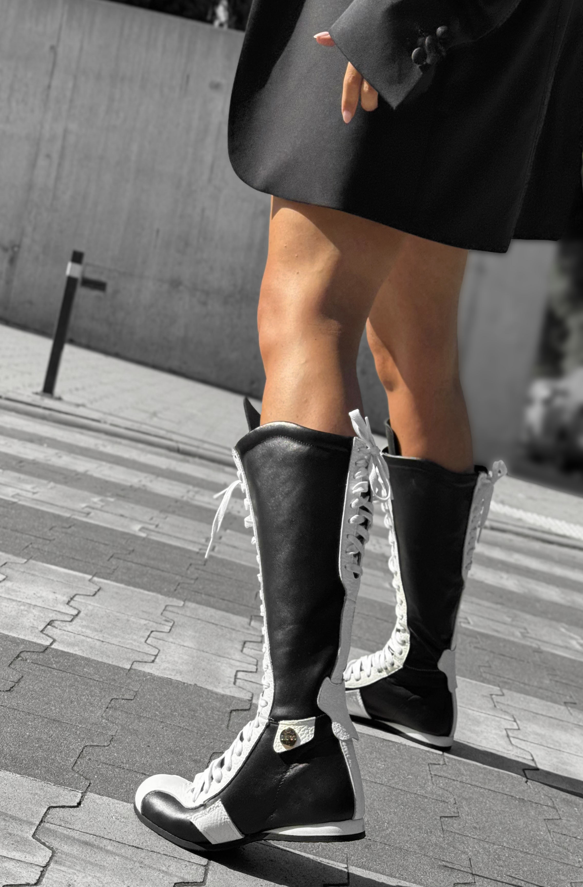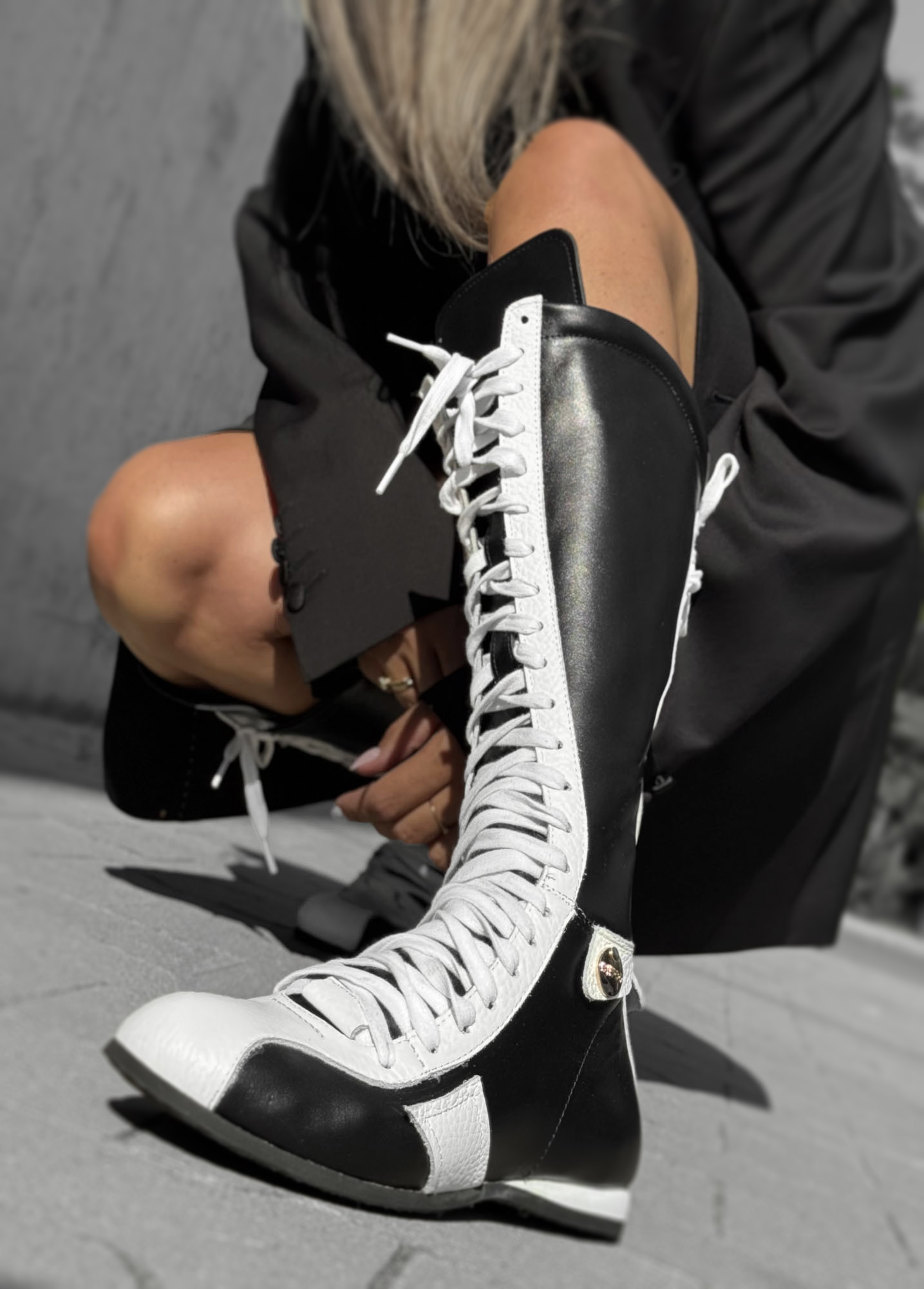 Boxershoes to  propozycja dla wszystkich kobiet ceniące sobie wygodę i niepowtarzalny wygląd. Wykonane z najwyższej jakości skóry naturalnej. Połączenie koloru czarnego z białym doskonale wpasuje się w większość stylizacji. Koturn - klin dodaje kilka centymetrów wzrostu i optycznie wysmukla sylwetkę. Wnętrze butów zaprojektowane zostało z myślą o komforcie, co sprawia, że doskonale nadają się do codziennych stylizacji.