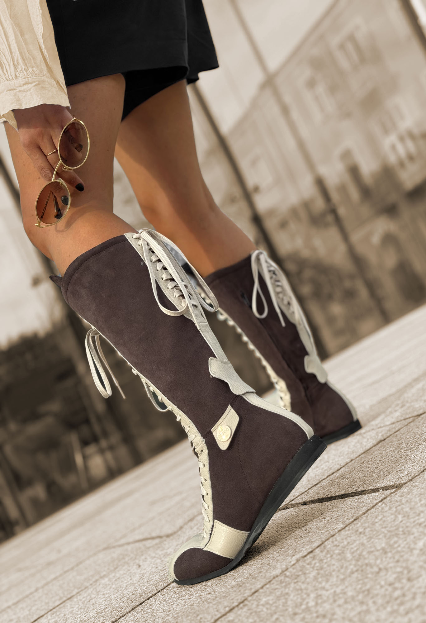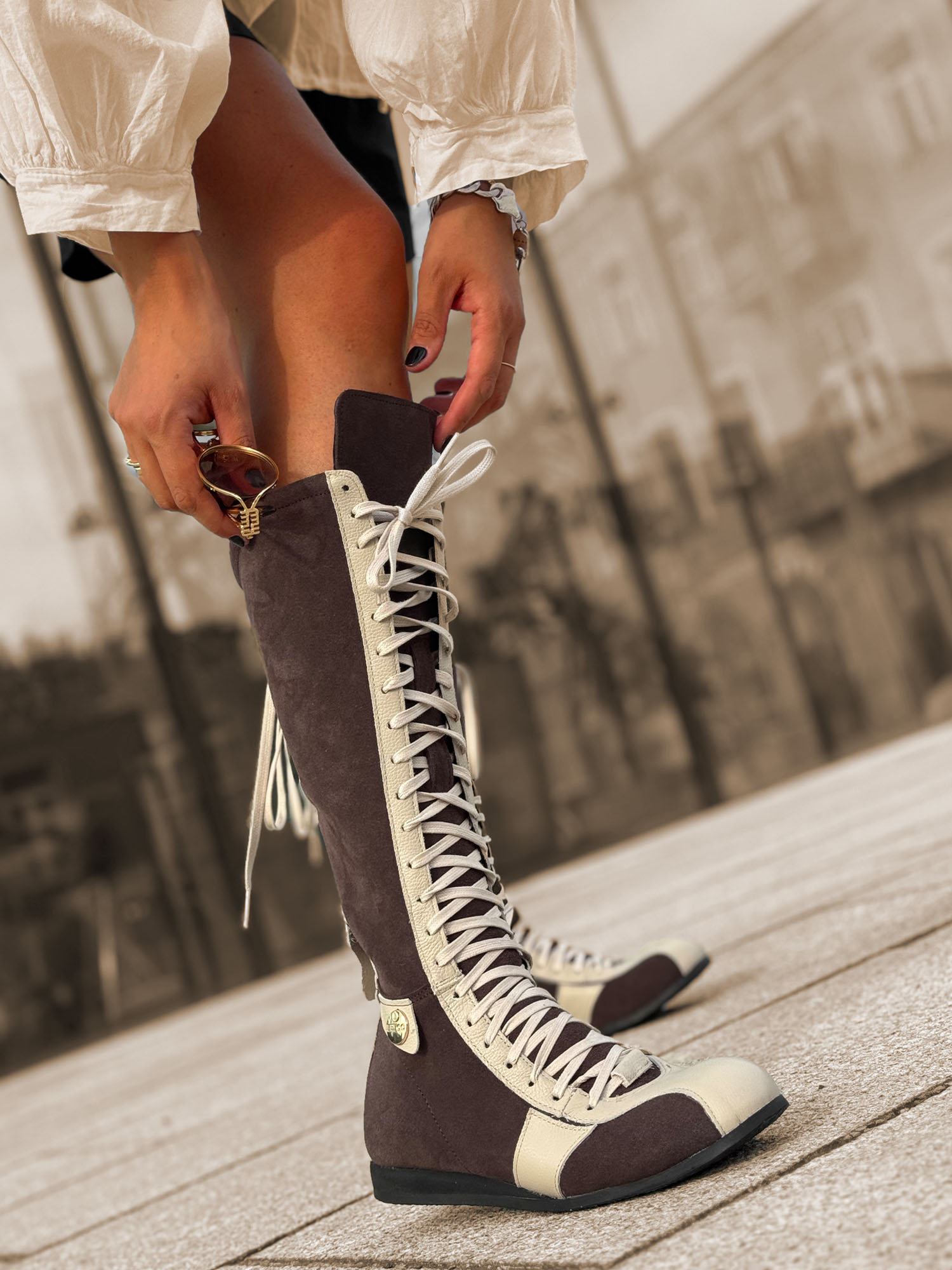 Boxershoes to  propozycja dla wszystkich kobiet ceniące sobie wygodę i niepowtarzalny wygląd. Wykonane z najwyższej jakości skóry naturalnej. Połączenie koloru brązowego z beżem doskonale wpasuje się w większość stylizacji. Koturn - klin dodaje kilka centymetrów wzrostu i optycznie wysmukla sylwetkę. Wnętrze butów zaprojektowane zostało z myślą o komforcie, co sprawia, że doskonale nadają się do codziennych stylizacji.