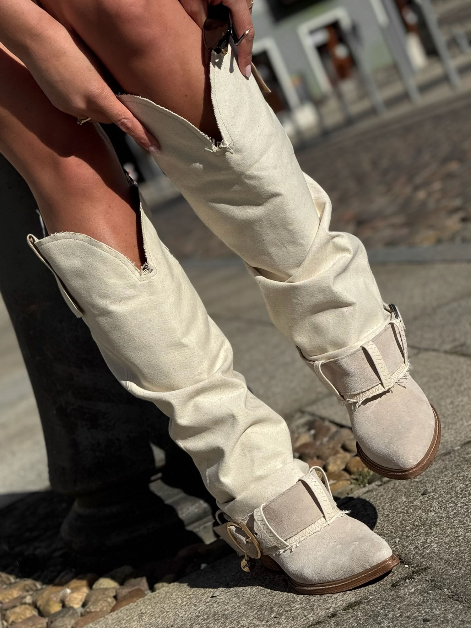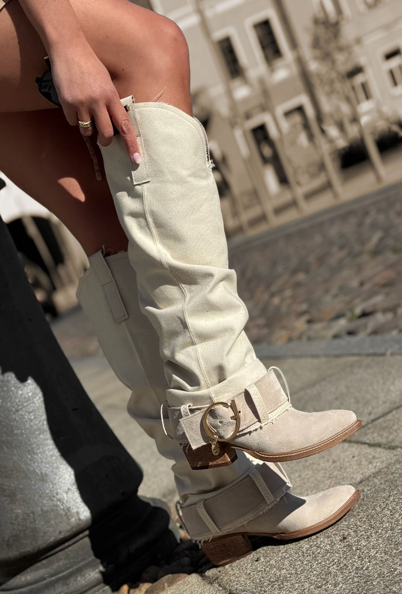 Skórzane kozaki na niskim obcasie grado beż len/ welur Beyco