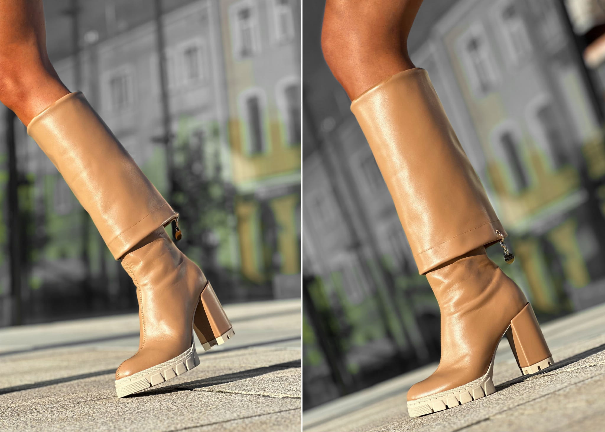 Skórzane kozaki na wysokim obcasie mok2024 miód lico Beyco OUTLET