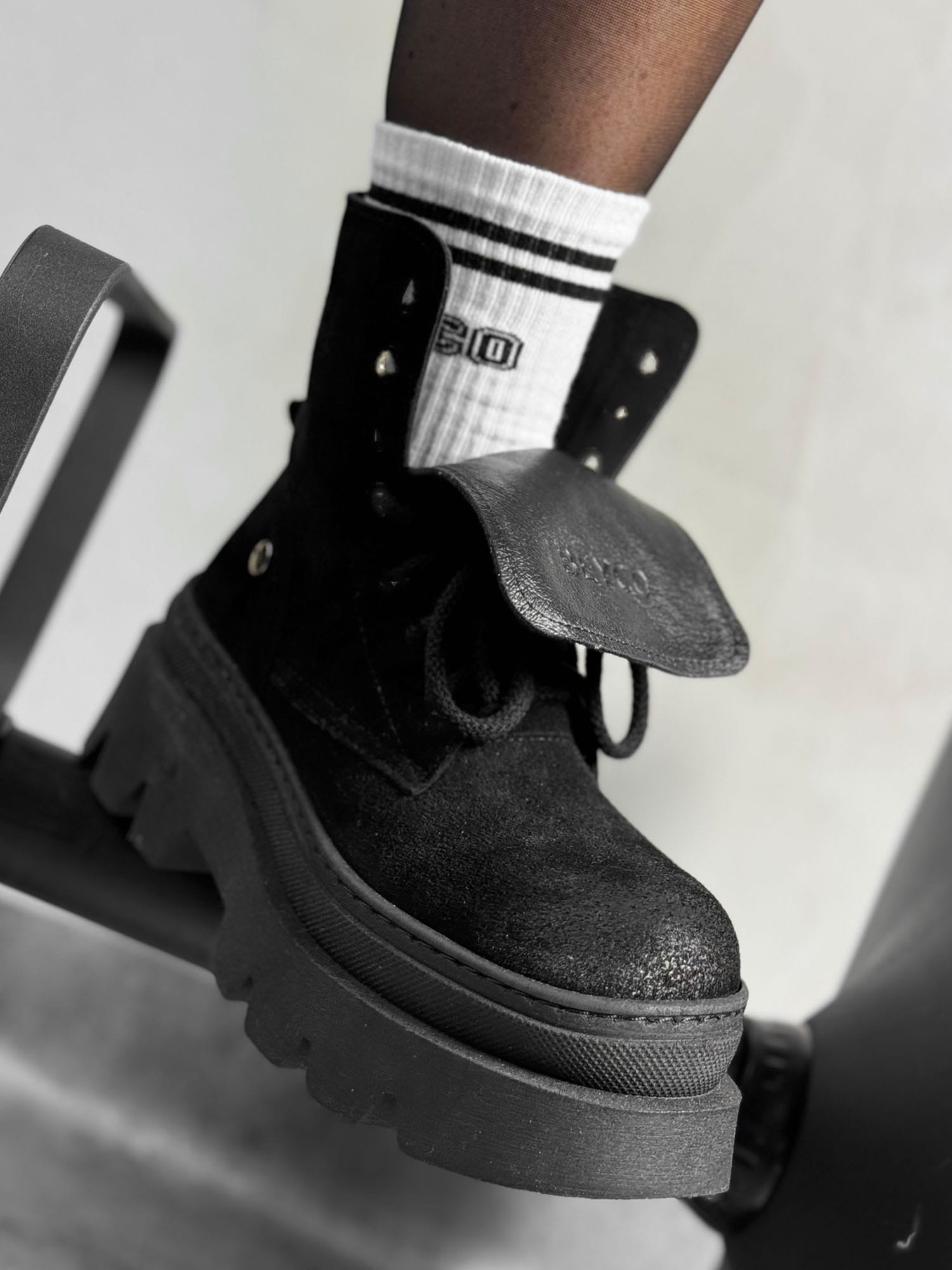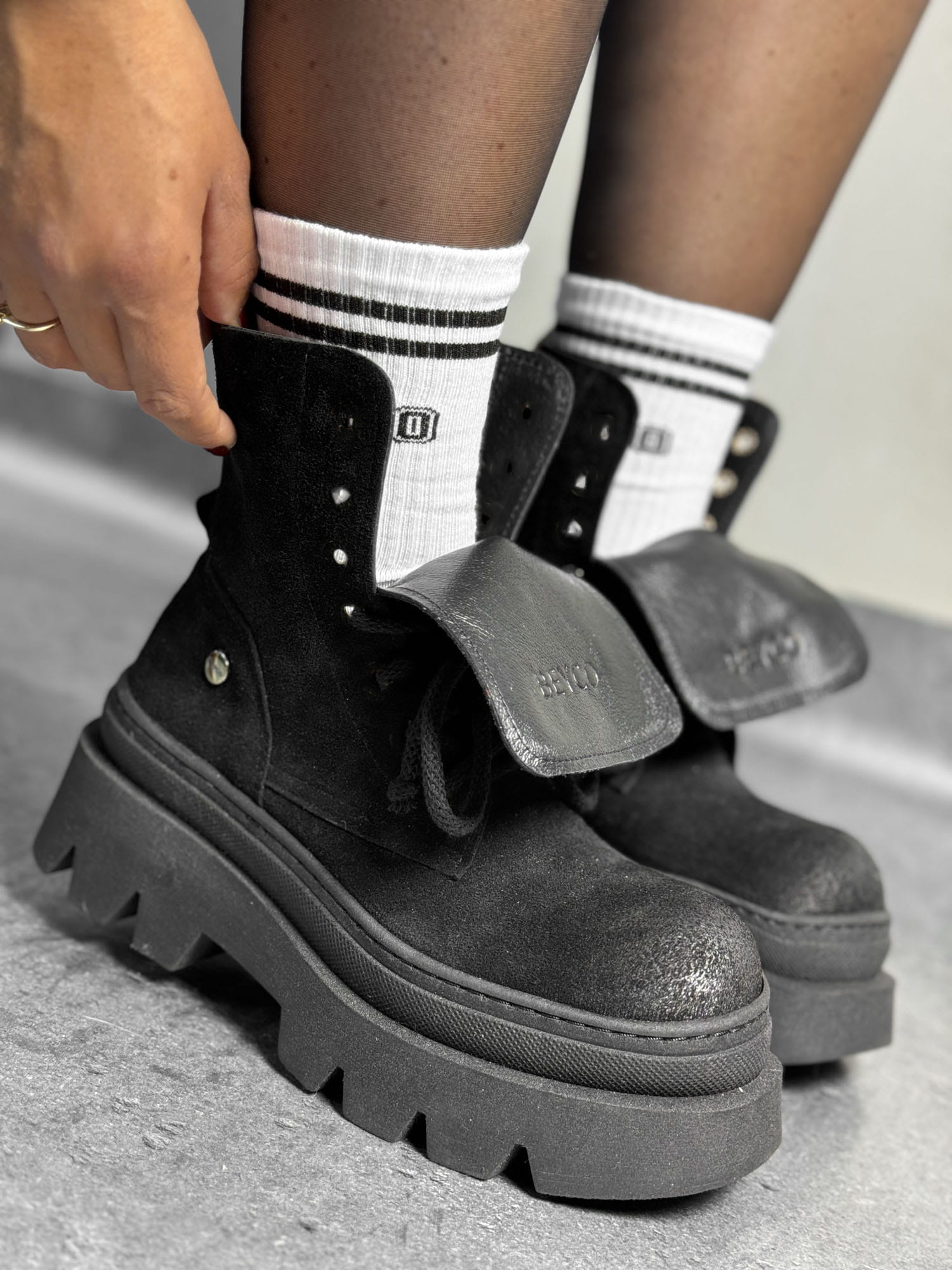 Workery na grubej podeszwie Ital7 to nowoczesna propozycja od Beyco. Najwyższej jakości zamszowa skóra naturalna w czarnym kolorze nadaje niepowtarzalny wygląd. Workery od Beyco to propozycja dla kobiet, które pragną wysmuklić swoją sylwetkę, a jednocześnie czuć się komfortowo. Wysokość obcasa jest praktycznie nieodczuwalna, dlatego workery są świetną propozycją na co dzień.