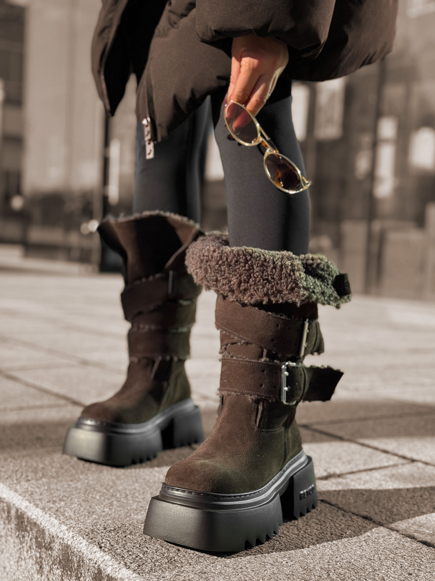 Modelka na zdjęciu ma 169 cm wzrostu i 34 cm w łydce, w najtęższym miejscu. Prezentuje rozmiar 37/38.