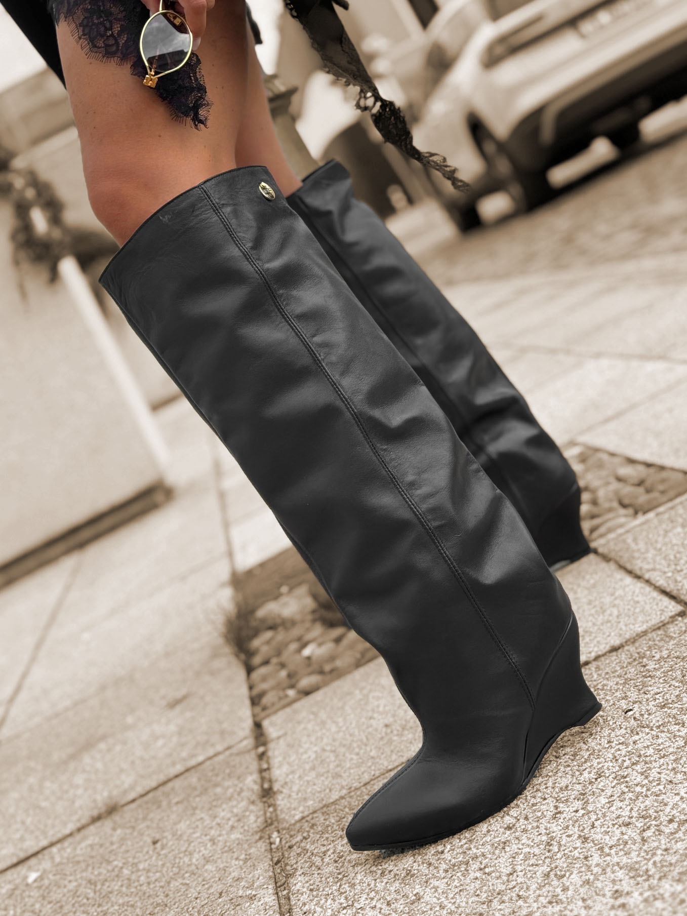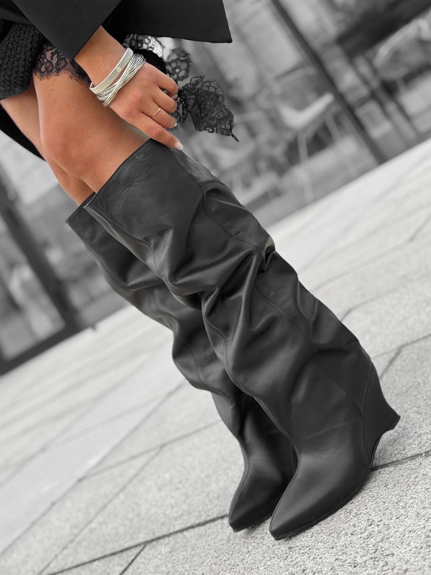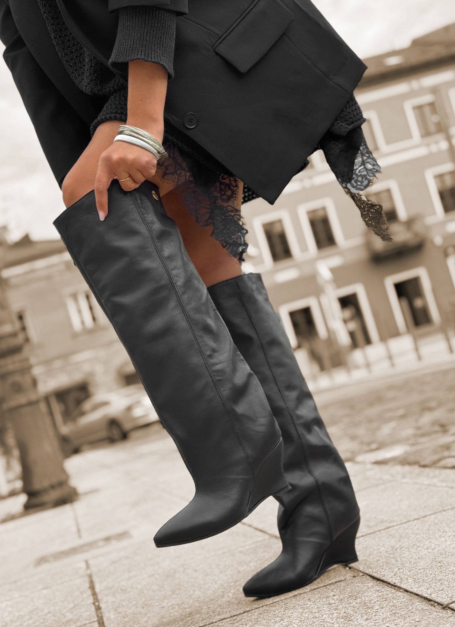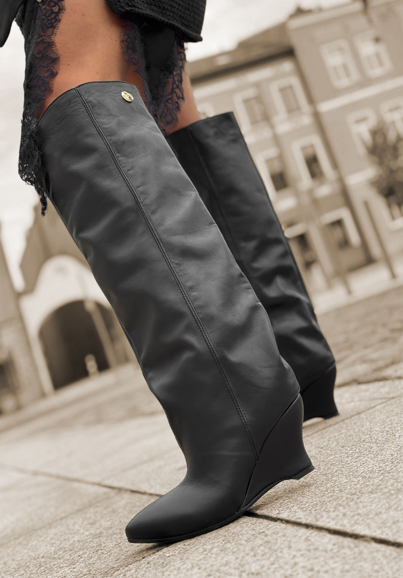 Kozaki można nosić na dwa sposoby - z cholewką podniesioną pod samo kolano oraz z cholewą opuszczoną, pomarszczoną.
